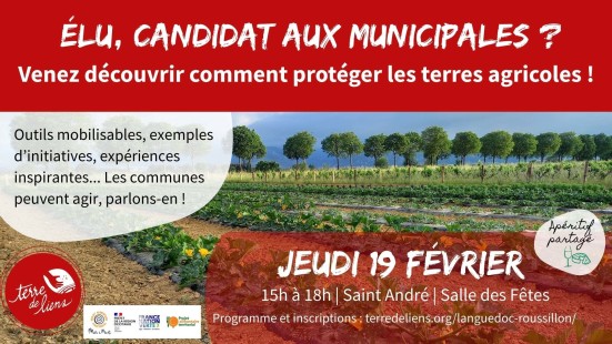 L'association Terre de Liens, partenaire du PAT Mar i Munt, vous propose un après-midi d'information et d'échange le jeudi 19 février 2026 de 15h à 18h à Saint-André (Salle des Fêtes, 10 allée de la Liberté).