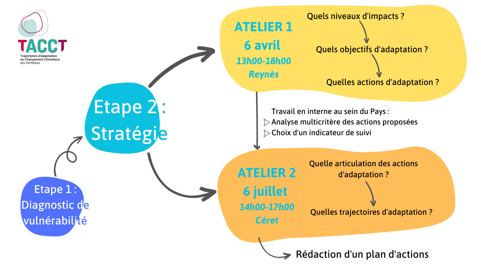 Nous sommes maintenant engagés dans l'étape 2, qui vise à élaborer, toujours en mode participatif, une stratégie et un plan d'actions concret pour s’adapter au changement climatique sur le territoire. Pour cela, deux ateliers sont organisés au cours du premier semestre 2023 :